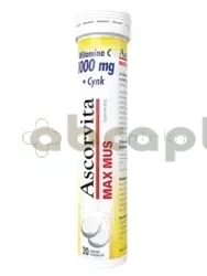 Ascorvita Max Mus zawiera wysoką zawartość witaminy C i cynk, które pomagają w prawidłowym funkcjonowaniu układu odpornościowego oraz wspierają ochronę komórek przed stresem oksydacyjnym.