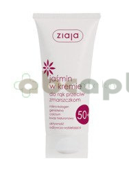 Ziaja, jaśmin w kremie do rąk przeciw zmarszczkom 50+ poprawia napięcie i zmniejsza szorstkość naskórka. Wyraźnie odżywia i zmiękcza naskórek oraz rozjaśnia plamy i przebarwienia skórne.
