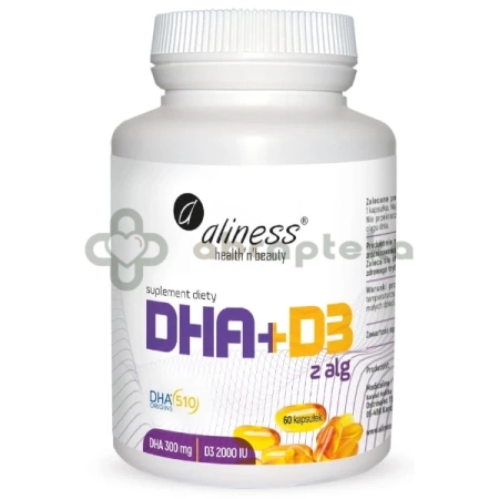 - Aliness Omega DHA z alg + D3 jest suplementym wzbogacającym dietę o kwas omega 3 DHA oraz witaminę D3 wspierające odporność.