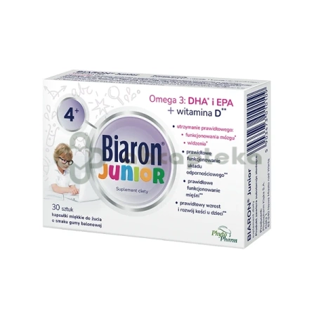 - Preparat stworzony specjalnie dla dzieci – ma postać kapsułek do żucia o smaku owocowej gumy balonowej. Suplement diety Bioaron Junior pomaga uzupełnić codzienną dietę dzieci powyżej 4. roku życia w witaminę D oraz kwasy tłuszczowe – DHA i EPA.