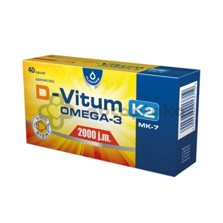 - D-Vitum 2000 j.m. K2 MK7 Omega-3 jest suplementem zawierającym witaminy D i K oraz kwasy omega-3. Preparat ma kompleksowy skład wspomagający dobrą kondycję kości i wzroku, a także pracę serca, mózgu i układu immunologicznego.