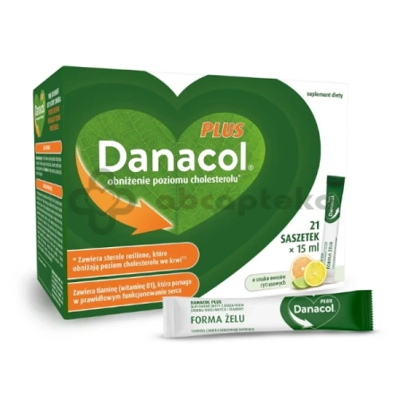 - Danacol Plus jest suplementem w postaci gotowych do spożycia saszetek o smaku cytrusowym. Preparat zawiera sterole roślinne, których stosowanie połączone z dietą i wysiłkiem fizycznym mogą przyczynić się do obniżenia poziomu cholesterolu.