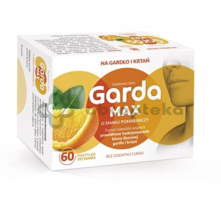 - Garda Max to nawilżające pastylki do ssania o smaku pomarańczowym. Suplement ma w składzie porost islandzki sprzyjający nawilżeniu gardła oraz krtani. Duże opakowanie - 60 pastylek.