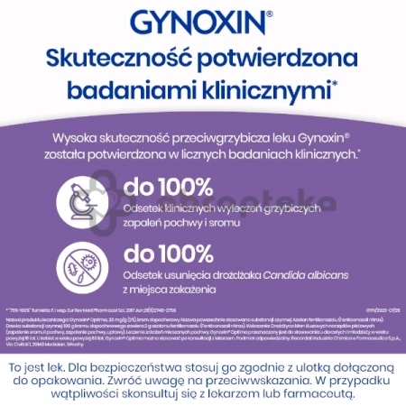Drożdżyca błon śluzowych narządów płciowych (zapalenie sromu i pochwy, zapalenie pochwy, upławy). Leczenie zakażeń mieszanych pochwy. Gynoxin przeznaczony jest do stosowania u dorosłych i młodzieży w wieku powyżej 16 lat. U kobiet w wieku powyżej 60 lat, Gynoxin można stosować po konsultacji z lekarzem.