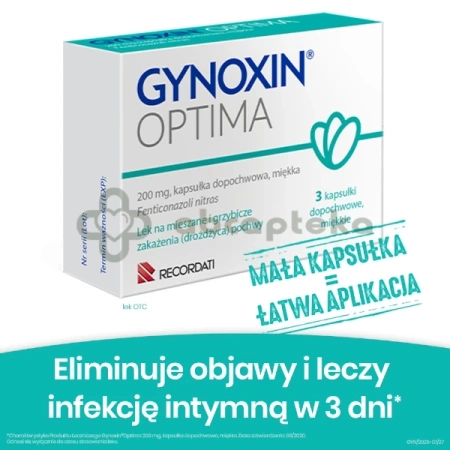 - Gynoxin Optima to miękkie kapsułki dopochwowe, które zawierają fentikonazol o szerokim zakresie działania przeciwgrzybiczego. Lek stosowany jest w mieszanym oraz grzybiczym zapaleniu pochwy i sromu.