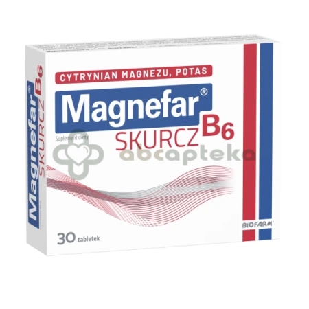 - Magnefar B6 Skurcz to suplement diety uzupełniający dietę w magnez, potas i kilka witamin z grupy B. Preparat wspiera pracę mięśni, serca i układu nerwowego.