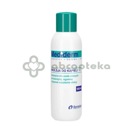 - Mediderm Bath to wyrób medyczny o charakterze emolientu. Stosuje się go do kąpieli w przypadku łuszczycy, egzemy i atopowego zapalenia skóry. Preparat długotrwale natłuszcza skórę, zmniejszając jej napięcie i nadmierne łuszczenie.