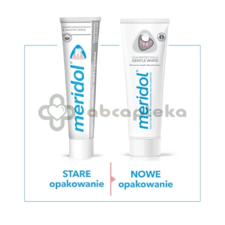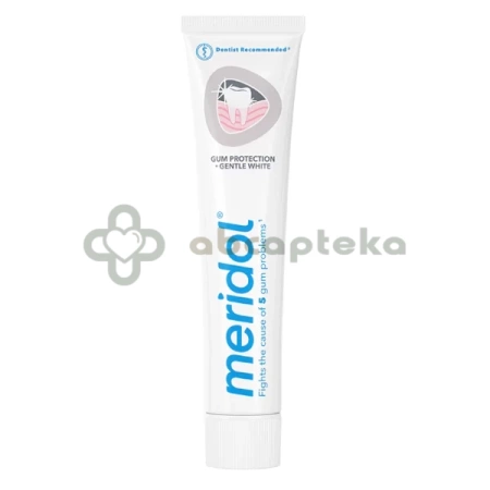 - Meridol Ochrona Dziąseł i Delikatne Wybielanie to pasta do mycia zębów, która pomaga zadbać o higienę jamy ustnej jednocześnie walcząc z płytką nazębną i wywoływanymi przez jej nagromadzenie objawami chorób dziąseł. Zawiera fluor, cynk i aminę.