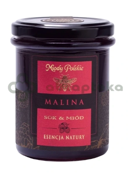 - Miody Polskie Miód & Sok Malina, to suplement diety, wzbogacony o witaminę C. Produkt, ten jest połączeniem miodu z sokiem malinowym.