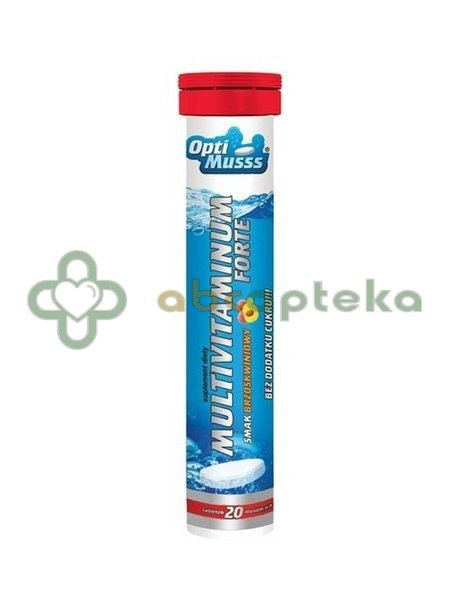 - Multivitaminum Forte OptiMusss to suplement diety wspomagający odporność organizmu. Zmniejsza uczucia zmęczenia i znużenia. Wspomaga zachować zdrowe włosy i skórę. Produkt przeznaczony dla osób dorosłych.