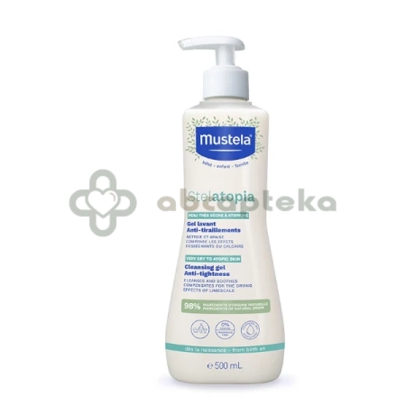 - Mustela, Stelatopia, żel do mycia jest kosmetykiem przeznaczonym do oczyszczania i pielęgnacji delikatnej skóry niemowląt, które mają skłonność do atopii. Produkt oczyszcza, koi i regeneruje skórę. Duże opakowanie z pompką - 500 ml.