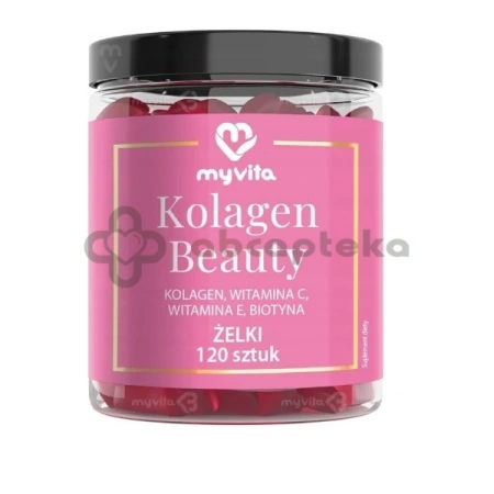 - MYVITA Kolagen Beauty jest suplementem w wygodnej postaci żelków, zawierającym 500 mg kolagenu oraz witaminy dla wsparcia zdrowej skóry, włosów i paznokci. Duże opakowanie - 120 żelków.