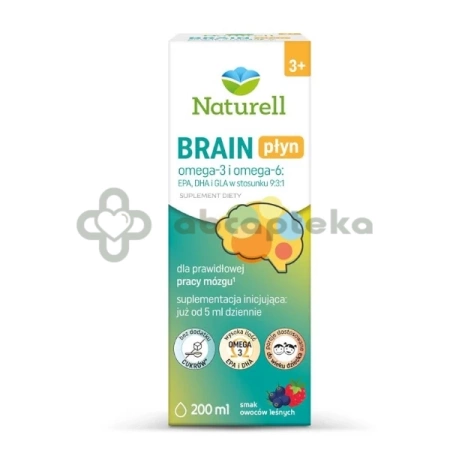 Naturell Brain w płynie to suplement diety dedykowany dzieciom po ukończeniu 3. roku życia, a także osobom dorosłym. Preparat zawiera kwasy omega-3 : EPA (kwas eikozapentaenowy) i DHA (kwas dokozaheksaenowy) oraz omega-6 : GLA (kwas gamma-linolenowy). Są one istotne dla wsparcia pracy mózgu (w tym funkcji poznawczych) oraz funkcjonowania układu nerwowego. Zaletą preparatu jest jego płynna forma, która nie sprawia problemu z przełykaniem oraz umożliwia szybsze wchłanianie zawartych substancji. Produkt ma przyjemny smak owoców leśnych.