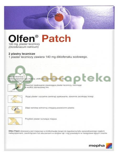 - Olfen Patch to plastry lecznicze stosowane miejscowo na skórę w przypadku stłuczeń, urazów, nadwyrężeń. Działają przeciwbólowo i przeciwzapalnie, zmniejszają powstały obrzęk.