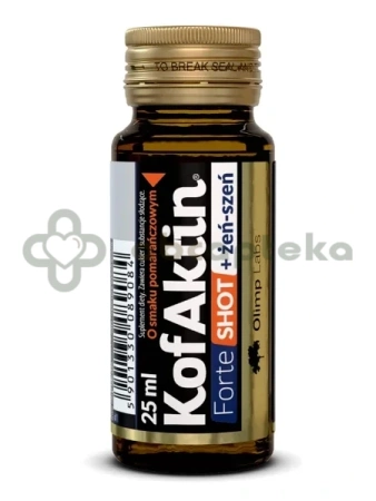 - OLIMP KofAktin forte shot+żeń-szeń 25 ml to suplement diety wspaierający organizm w walce z oznakami zmęczenia oraz utrzymaniu czujności i witalności.