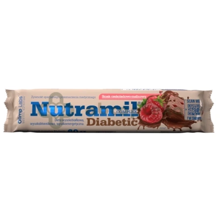 - Olimp, Nutramil Complex Diabetic to baton wysokoenergetyczny o dużej zawartości białka i błonnika, przeznaczony do postępowania dietetycznego u osób z niedożywieniem bądź z cukrzycą. Baton o smaku czekoladowo-malinowym.