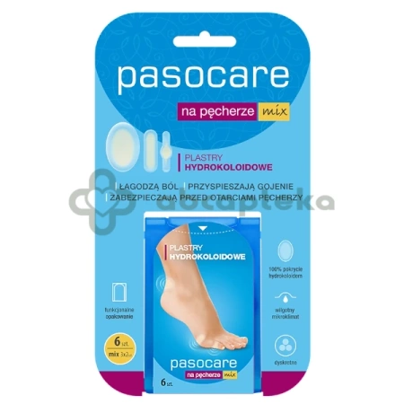 - Plastry na pęcherze mix PASOCARE to zestaw 6 plastrów w 3 rozmiarach. Stosuje się je w celu ochrony pęcherzy przed kolejnymi uszkodzeniami i otarciami. Plastry są hydrokoloidowe, dzięki czemu tworzą na uszkodzonym miejscu optymalne warunki do gojenia.