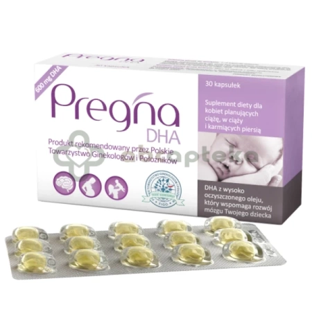 - Pregna DHA to nowoczesny suplement diety dla kobiet w ciąży i mam karmiących piersią w celu uzupełnienia w diecie niedoboru DHA (kwasu dokozaheksaenowego). Składnik ten jest niezbędny do prawidłowego rozwoju mózgu dziecka.