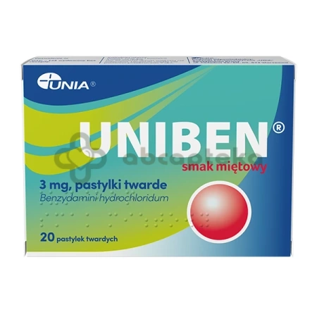 - Uniben smak miętowy to lek przeciwbólowy i przeciwzapalny stosowany przy chorobach jamy ustnej. Lek ma postać pastylek twardych do ssania o smaku miętowym i ma miejscowe działanie znieczulająco - odkażające. Dla dorosłych i dzieci powyżej 6 r.ż.